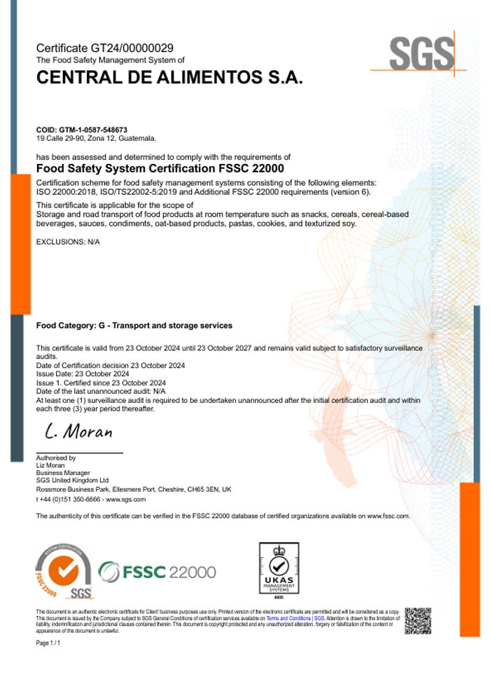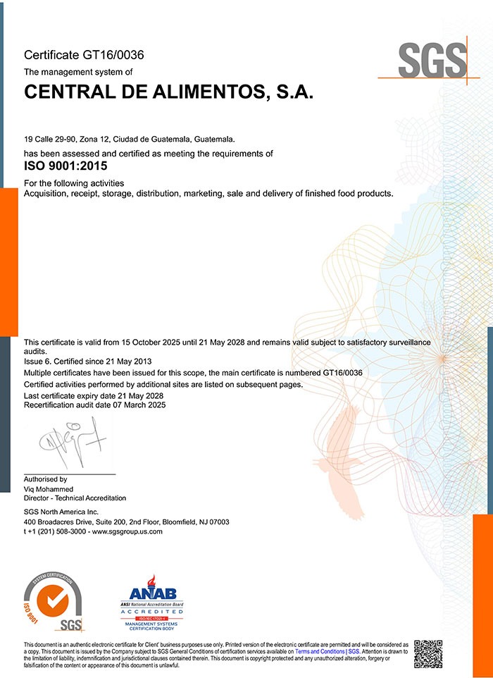 En Central de Alimentos, S. A. aseguramos la Calidad y la Inocuidad en la comercialización de alimentos de consumo humano que satisface las necesidades de nuestros clientes por medio de: