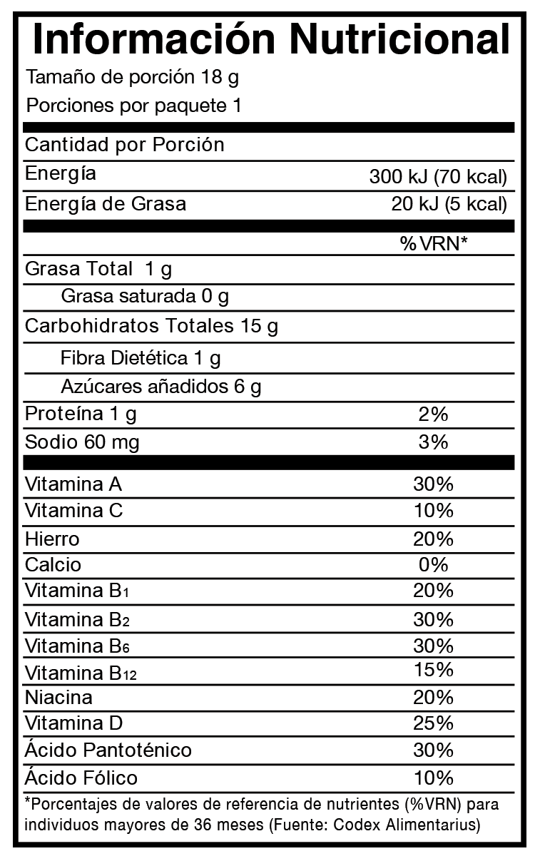 Harina de maíz , azúcar, harina de avena, oleína de palma, sabor artificial de frutas, sal, vitaminas y minerales (ácido ascórbico, ascorbato de sodio, maltodextrina, nicotinamida, vitamina A como palmitato, hierro, pantotenato de calcio, vitamina D3, clorhidrato de piridoxina, vitamina B12, riboflavina, mononitrato de tiamina y ácido fólico), dióxido de titanio, tartracina, rojo allura AC, y azul brillante FCF (colorantes), mono y digliceridos (emulsificante) y BHT (antioxidante).