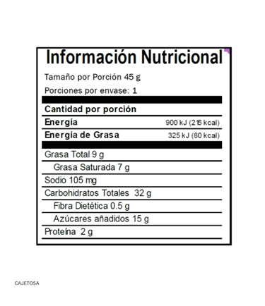 Galleta [Harina de trigo, azúcar, jarabe de azúcar invertido, leche condensada, lecitina de soya,(emulsificante), sal yodada, color caramelo clase I (colorante), bicarbonato de sodio y bicarbonato de amonio, (reguladores de acidez) y saborizante artificial], cobertura sabor a chocolate 24% [azúcar, grasa vegetal (contiene ácido cítrico y BHT como antioxidantes), cocoa, sólidos de leche, maltodextrina, lecitina de soya (emulsificante) y saborizante, artificial], dulce tipo cajeta 22% [jarabe de glucosa, jarabe de alta fructosa, azúcar, leche descremada en polvo, agua, glicerina, aceite hidrogenado de soya, proteína de leche, grasa láctea, pectina (espesante), color caramelo clase IV, (colorante), fosfato de sodio (regulador de acidez), lecitina de soya (emulsificante), y sorbato de potasio (conservante),