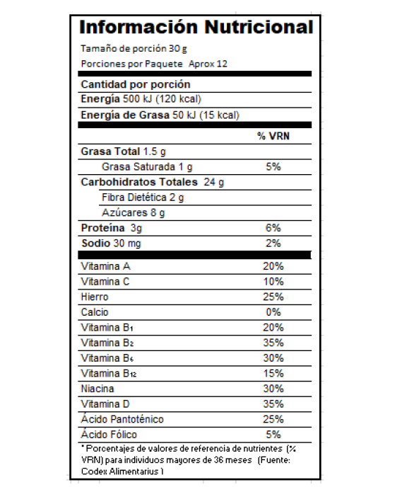 Cereal tipo granola. Mezcla de cereales, gotitas de yogurt y sabor chocolate, tostada. Fortificada con 10 vitaminas y hierro.7