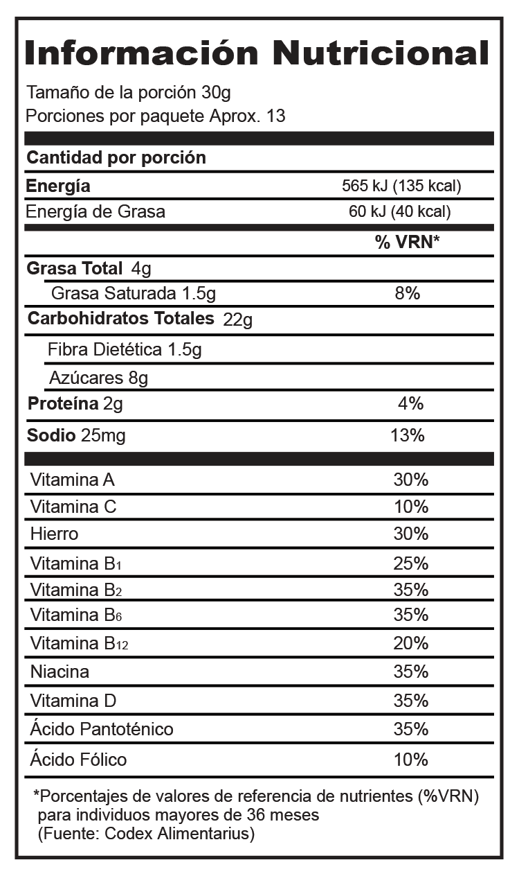 Cereal tipo granola. Mezcla de cereales, nueces, pasas y miel de abeja, tostada. Fortificada con 10 vitaminas y hierro.