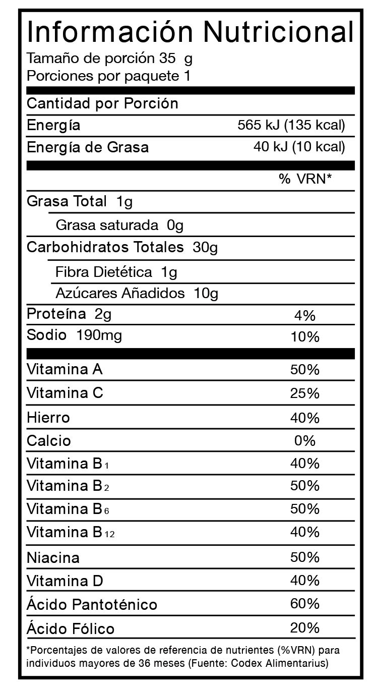 Mezcla de hojuelas de maíz azucaradas con aritos de maíz y avena sabor frutas. Fortificada con vitaminas y hierro.