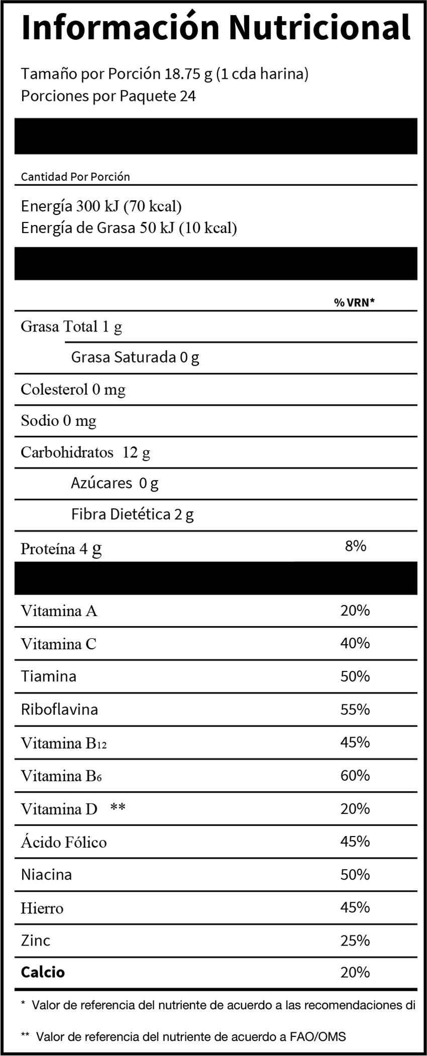 Harina de maíz, harina de soya, vitaminas y minerales (carbonato de calcio, glicinato ferrico, zinc aminoquelado, Niacina, maltodextrina, vitamina A , vitamina D3, riboflavina, vitamina B12, tiamina, ácido fólico, vitamina B6 y vitamina C) y BHA (antioxidante).