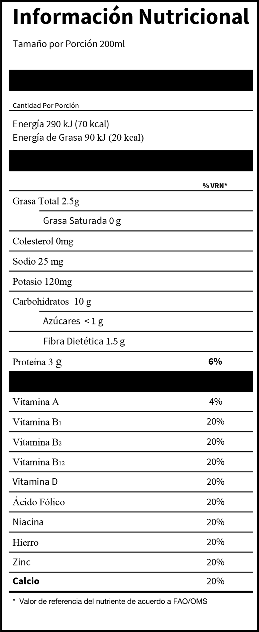 Agua, harina de maíz, maltodextrina, aislado de soya, aceite de soya, oligoofructosa, estabilizantes (celulosa microcristalina, carboximetilcelulosa sódica y carragenina), sabores naturales y artificiales, sucralosa, vitaminas y minerales (carbonato de calcio, glicinato férrico, zinc aminoquelado, niacinamida, maltodextrina, vitamina A , vitamina D3, riboflavina, mononitrato de tiamina, cianocobalamina, ácido fólico).