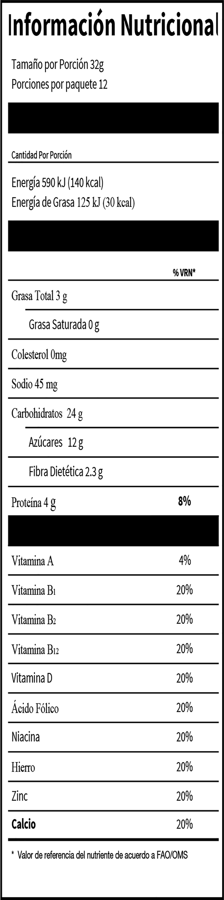 Avena molida, azúcar, sólidos de maíz, aislado de soya, harina de arroz, aceite de coco, caseinato de sodio, sal, mono y digliceridos (emulsificante), silicato de aluminio y sodio (antiglutinante), carragenina, lecitina de soya, goma guar y goma xantan (estabilizantes), sabores naturales y artificiales, cúrcuma y annato (colorantes), vitaminas y minerales (fosfato dipotásico, fosfato de calcio, pantotenato de calcio, carbonato de calcio, glicinato férrico, zinc aminoquelado, niacinamida, maltodextrina, vitamina A , vitamina D3, riboflavina, mononitrato de tiamina, cianocobalamina, ácido fólico).