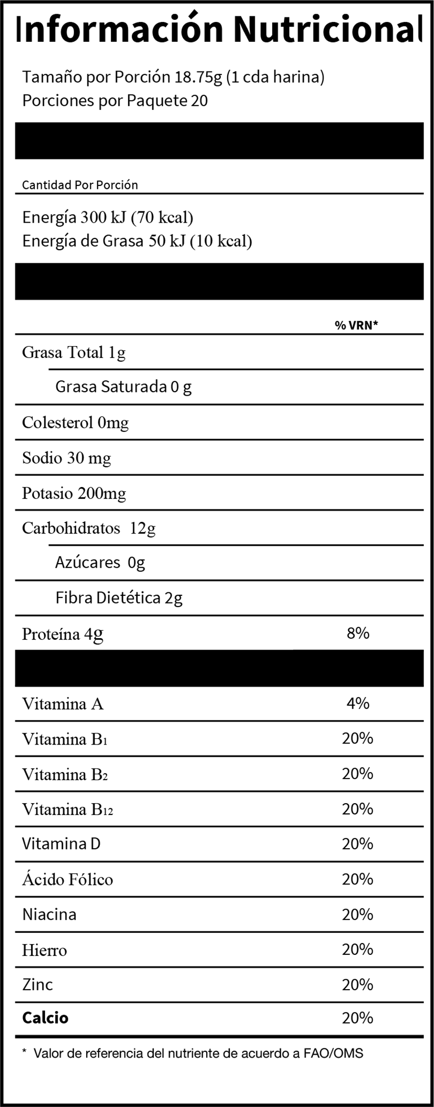 Harina de maíz, harina de soya, harina de avena, cocoa en polvo 6%, extracto de malta en polvo, leche descremada en polvo, sal, vitaminas y minerales (carbonato de calcio, glicinato ferrico, zinc aminoquelado, niacinamida, maltodextrina, vitamina A , vitamina D3, riboflavina, mononitrato de tiamina, cianocobalamina, ácido fólico) y BHA (antioxidante).