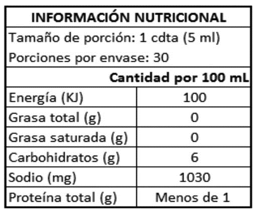 Agua, chiles dulce verde y jalapeño, cebolla, vinagre de caña, azúcar, sal, limón, ajo, goma xanthan (espesante), especias, ácido ascórbico (antioxidante), ácido acético (regulador de acidez).