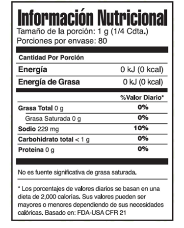Sal de mar, ácido cítrico (regulador de la acidez), chile de árbol en polvo, tomate en hojuelas, ajo granulado, cebolla granulada, hojuela de papa, harina de arroz, dióxido de silicio (antiglutinante), ajonjolí y especias varias.