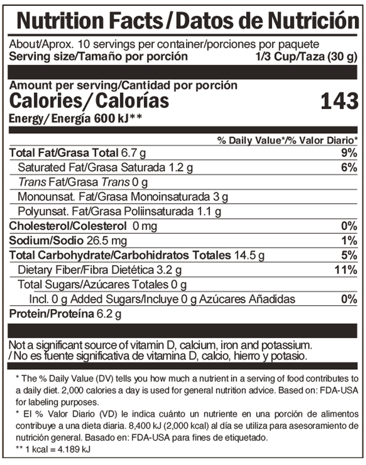 Hojuelas de avena integral, maní horneado marañón horneado, aceite vegetal (canola y soya), pepitoria tostada, alulosa, canela en polvo, sabor natural, jugo concentrado de fruta del monje <1% (edulcorante natural).