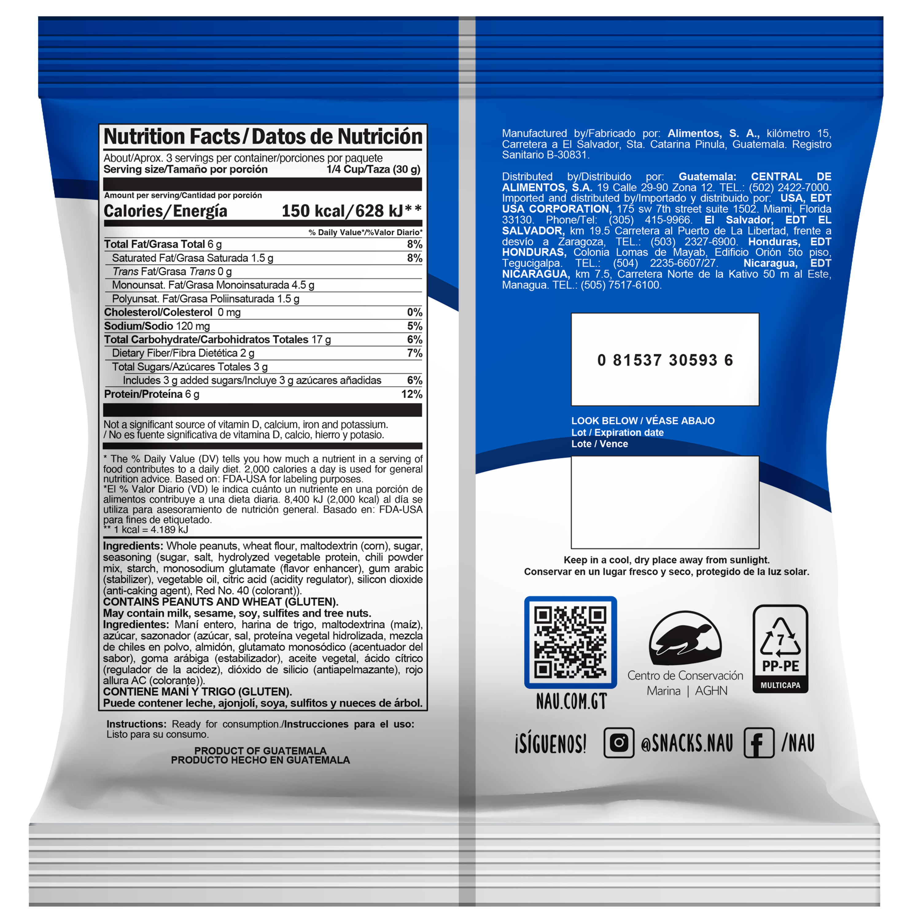CONTIENE MANÍ Y GLUTEN. Elaborado en equipo que también procesa productos que contienen leche, soya y sulfitos.