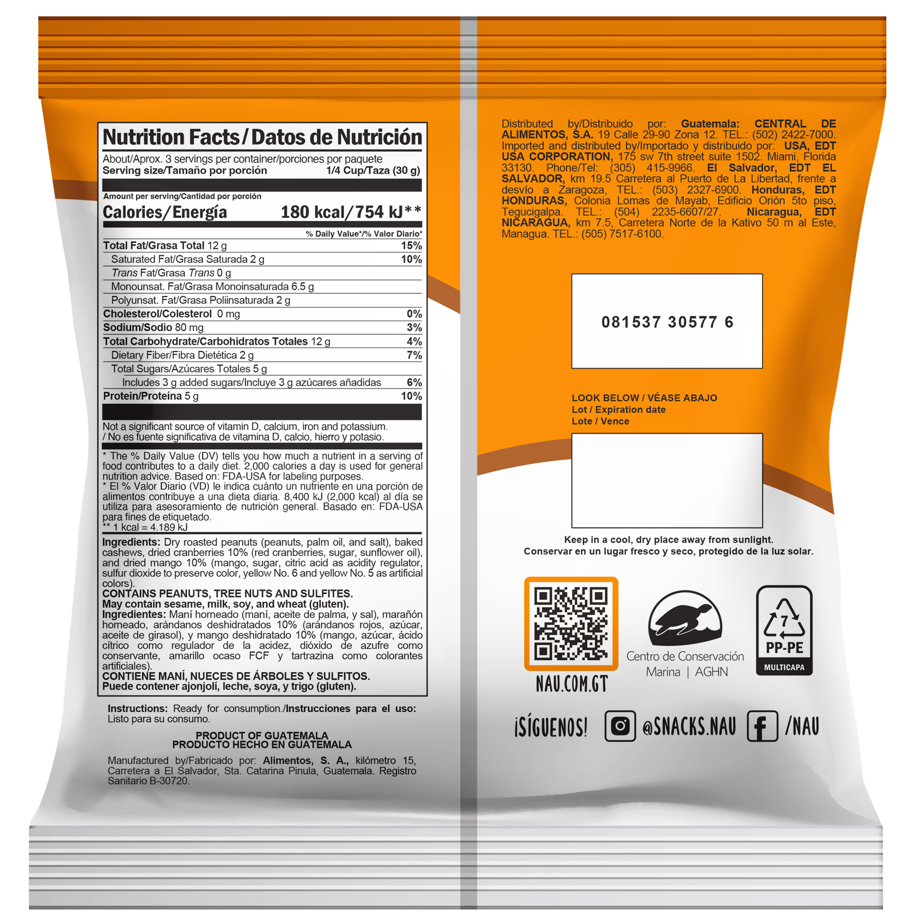 Maní, aceite de palma, marañón, arándanos rojos deshidratados 10% (arándanos, azúcar, aceite de girasol), mango deshidratado 10% (mango, azúcar, dióxido de azufre como preservante), sal y TBHQ (antioxidant).