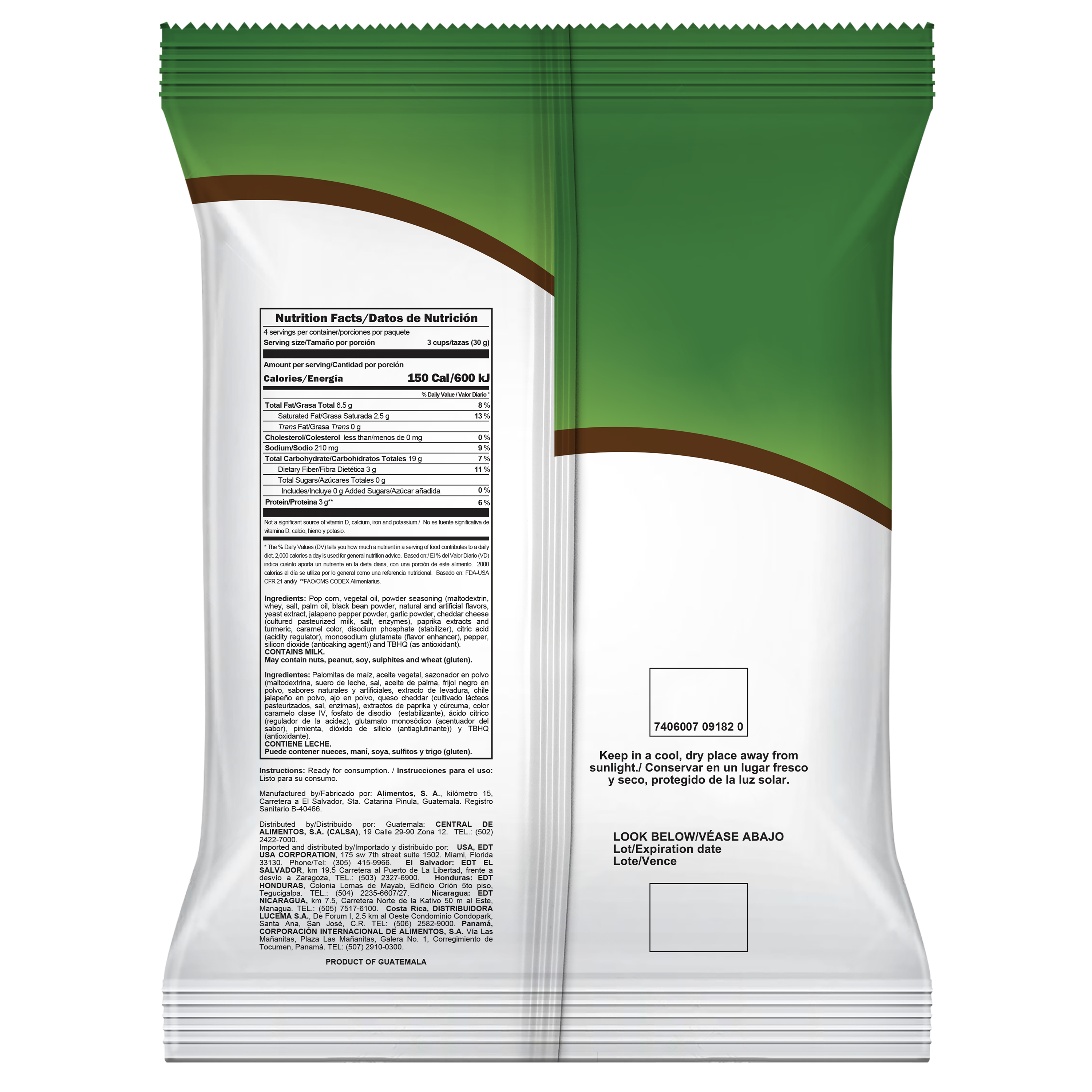 Ingredientes: Palomitas de maíz, aceite vegetal, sazonador en polvo (maltodextrina, suero de leche, sal, aceite de palma, frijol negro en polvo, sabores naturales y artificiales, extracto de levadura, chile jalapeño en polvo, ajo en polvo, queso cheddar (cultivado lácteos pasteurizados, sal, enzimas), extractos de paprika, color caramelo clase IV, tartracina y amarillo ocaso FCF (colorantes), fosfato de disódico (estabilizante), ácido cítrico (regulador de la acidez), glutamato monosódico (acentuador del sabor), pimienta, dióxido de silicio (antiaglutinante)) y TBHQ (antioxidante).