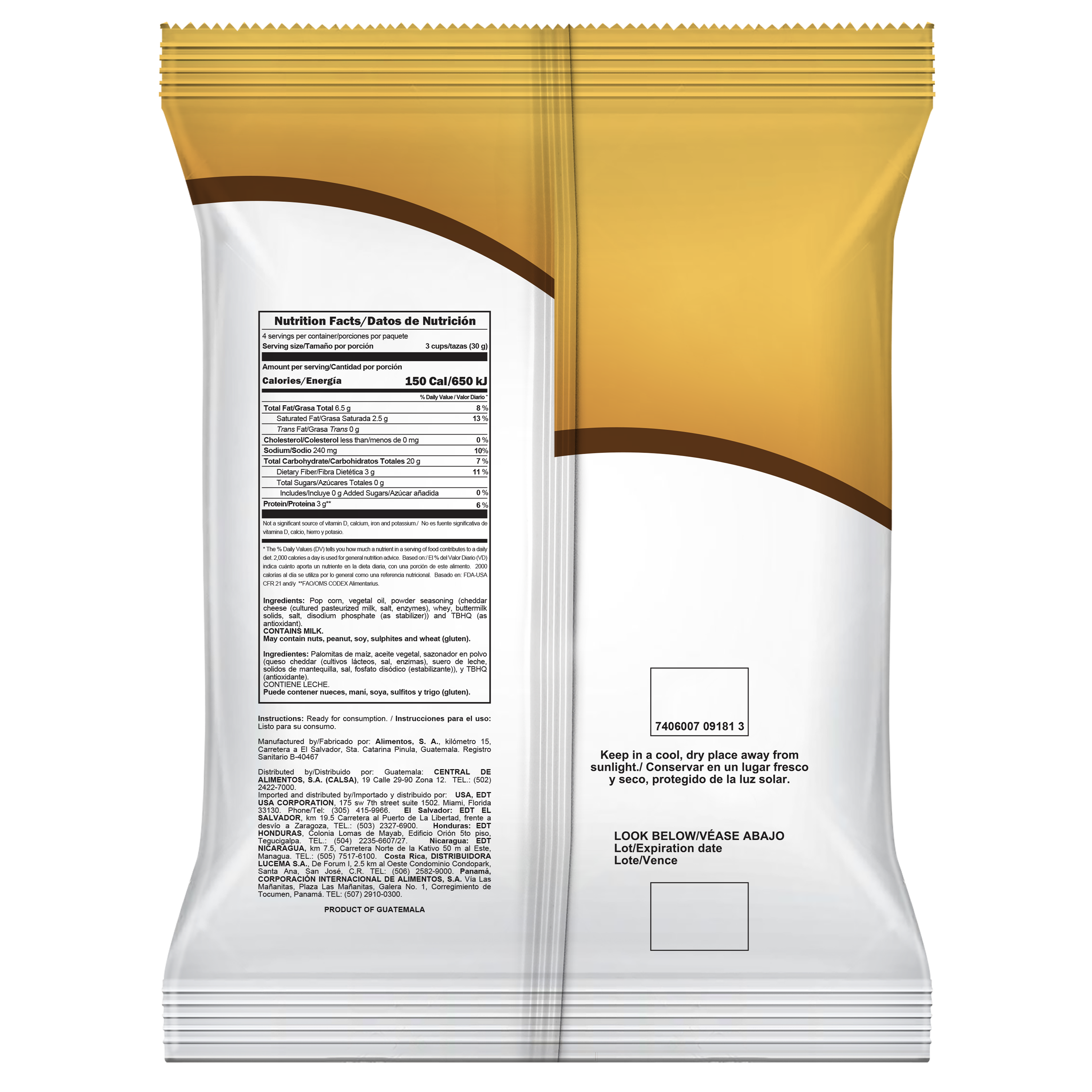 Palomitas de maíz, aceite vegetal, sazonador en polvo (queso cheddar (cultivos lácteos, sal, enzimas), suero de leche, solidos de mantequilla, sal, fosfato disódico (estabilizante)), y TBHQ (antioxidante).