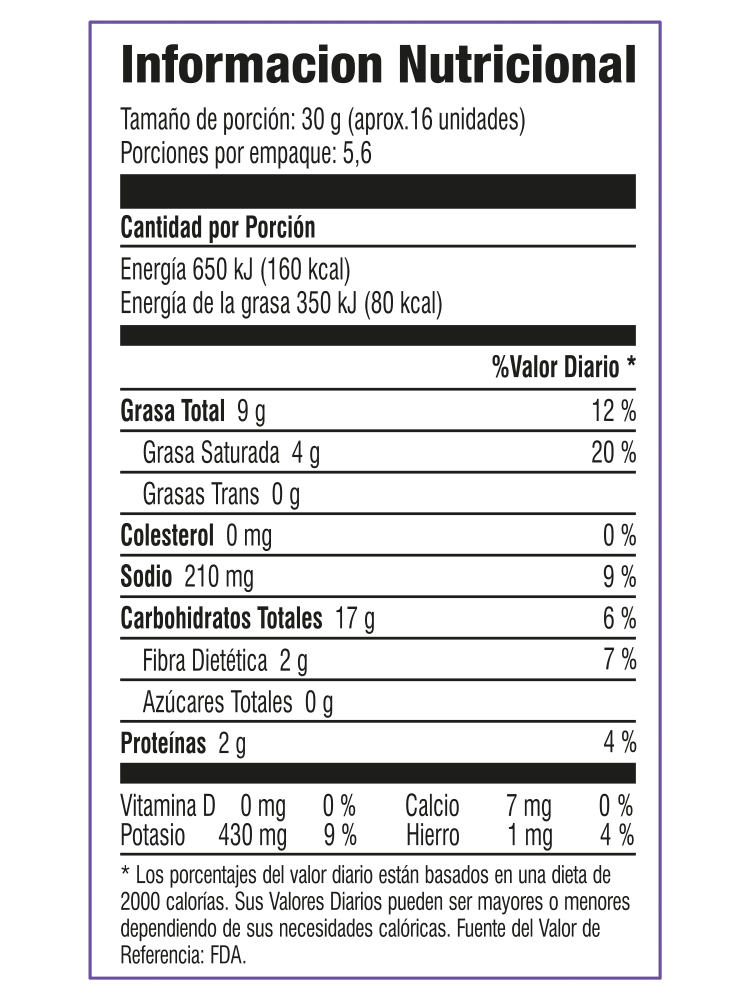 "ngredientes: papas, aceite vegetal de palma y condimento sabor a chile limón (sal, maltodextrina, reguladores de la acidez (ácido cítrico, diacetato de sodio), arroz, acentuadores de sabor y aroma (glutamato monosódico, inosinato disódico), suero de leche, tomate en polvo, mezcla base tipo jugo de limón, paprika, cebolla, almidón modificado de maíz, ajo, especia, vinagre, dextrosa, colorantes (rojo allura AC, tartracina), aceite desodorizado de soya, oleorresina y saborizante artificial.