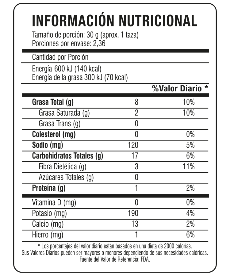 Puede contener trazas de maní y frutos secos. Consumir con moderación si se sigue una dieta baja en sodio.