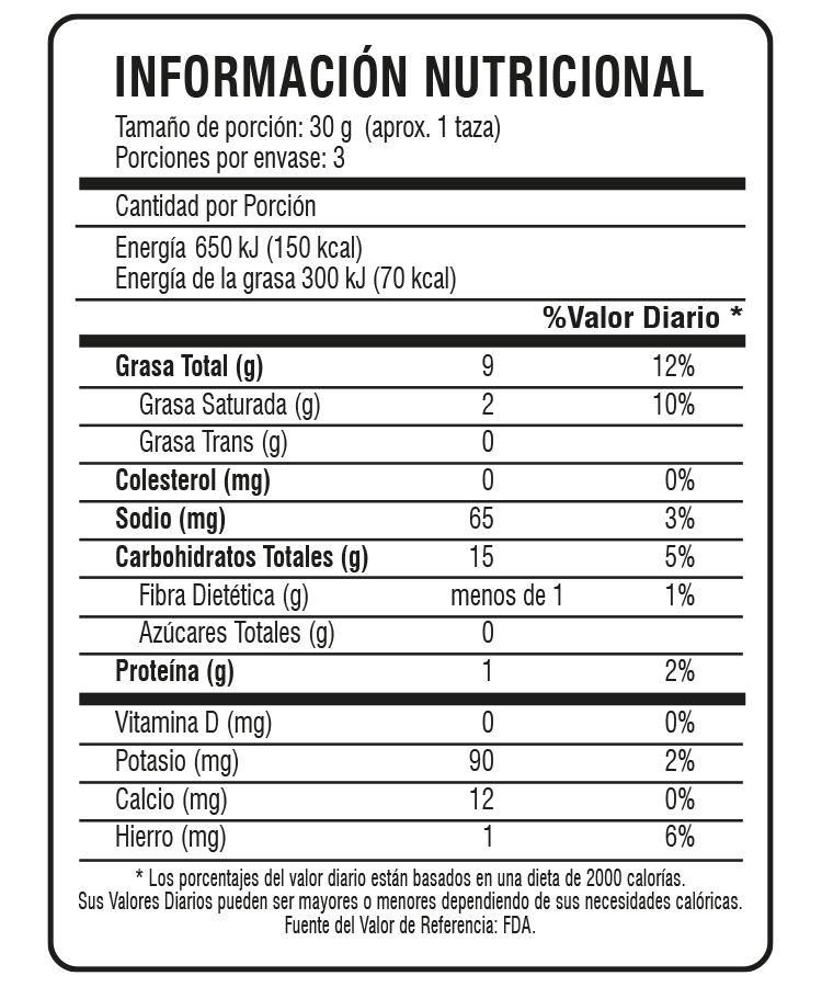 Plátano verde, aceite vegetal, sal, chicharrón deshidratado. Puede contener trazas de maní u otros frutos secos por líneas compartidas.