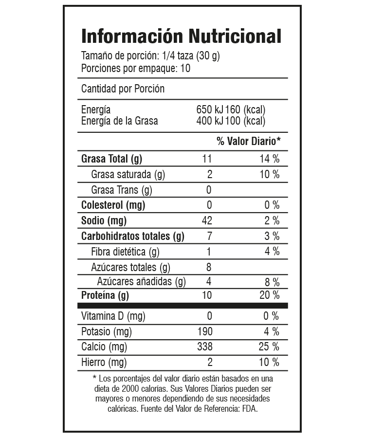 Puede contener trazas de maní y otros frutos secos. Consumir con moderación si se sigue una dieta baja en sodio o azúcar.