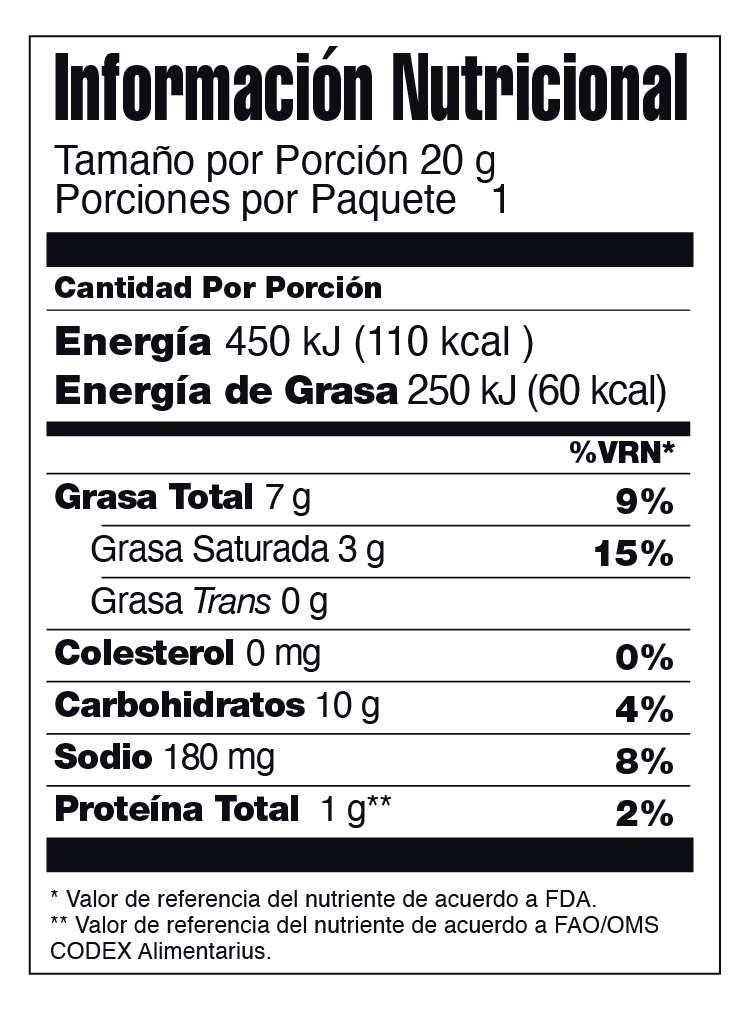 Sémola de Maíz, Aceite de Palma, Sazonador de Queso (Suero de Leche en Polvo, Maltodextrina, Aceite de Soya Parcialmente Hidrogenado, Sal, Proteína Láctea, Queso Cheddar (cultivos lácteos, sal, enzimas), Glutamato Monosódico (acentuador del sabor), Extracto de Levadura, Fosfato Disódico (antiaglomerante), Sabor Natural a Queso, Ácido Cítrico (regulador de la acidez), Pimienta en Polvo, Tartracina y Amarillo Ocaso FCF (colorantes artificiales)), Carbonato Calcico (estabilizador), Mono y Diglicéridos (emulsificante) y TBHQ (antioxidante).