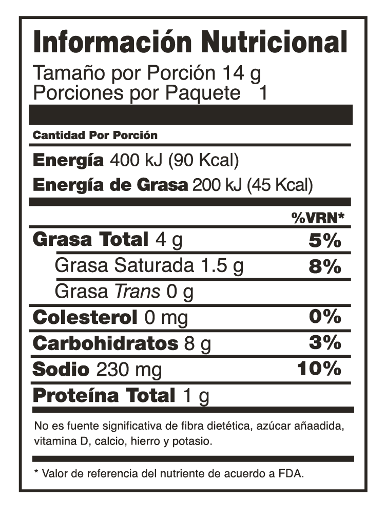 Harina de Trigo, Aceite de Palma, Almidón de Maíz, Sal, Sazonador Queso Chipotle (Maltodextrina, Cloruro de Potasio (estabilizador), Glutamato Monosódico (acentuador del sabor), Ácido Cítrico (regulador de la acidez), Mezcla de Chiles en Polvo, Saborizantes Naturales y Artificiales, Cebolla en Polvo, Suero en Polvo, Dextrosa, Ajo en Polvo, Inosinato Disódico y Guanilato Disódico (acentuadores del aroma), Tartracina, Amarillo Ocaso FCF y Rojo Allura AC (colorantes artificiales)), y TBHQ (antioxidante).