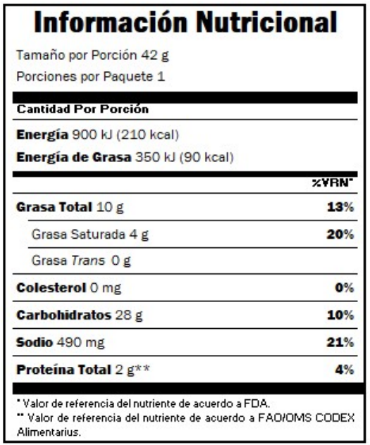 Tortilla chip (harina de maíz blanco nixtamalizado, aceite de palma, extracto de annato (colorante natural), hojuela de papa (harina de papa, sal), tornillo de maíz (harina de maíz nixtamalizada, almidón de maíz, sal yodada, bicarbonato de sodio y amarillo ocaso FCF), tornillo de trigo (harina de trigo enriquecida (harina de trigo, tiamina, riboflavina, niacina, hierro y ácido fólico), almidón de maíz, sal yodada, bicarbonato de sodio y amarillo ocaso FCF), condimento queso (maltodextrina (maíz), suero en polvo de leche, sal, glutamato monosódico (acentuador del aroma), cebolla en polvo, ajo en polvo, queso cheddar (cultivos lácteos pasteurizados, sal, enzimas), suero de mantequilla, queso romano (cultivos lácteos pasteurizados, sal, enzimas), aceite de soya, sabores naturales y artificiales, extracto de levadura, ácido cítrico, ácido láctico y diacetato de sodio (reguladores de la acidez), fosfato disódico (agente antiaglomerante), especias, proteína láctea, proteína vegetal hidrolizada, inosinato y guanilato de sodio (acentuadores del aroma), colorantes artificiales (tartracina, laca tartracina, amarillo ocaso FCF, laca amarillo ocaso FCF, rojo allura AC, color caramelo clase IV, y laca rojo Allura AC), mezcla de chiles, dióxido de silicio (antiaglomerante)).
