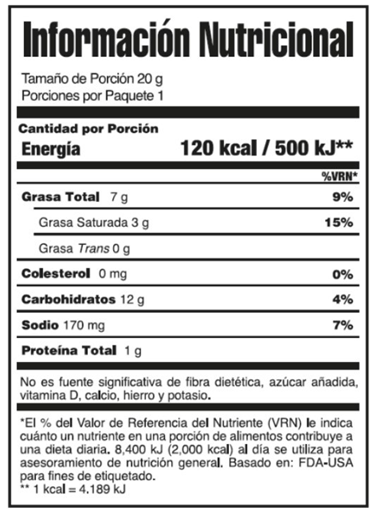 Sémola de maíz, aceite de palma, sazonador (suero de leche en polvo, sal yodada, maltodextrina (maíz), queso cheddar en polvo (leche pasteurizada y cultivada, sal y enzimas), glutamato monosódico (acentuador del sabor), ácido láctico (regulador de la acidez), sólidos lácteos en polvo, extracto de levadura, saborizantes artificiales y naturales a queso, jarabe de maíz, azúcar, almidón de maíz, ácido cítrico y fosfato disódico (reguladores de la acidez), proteína concentrada de leche, dextrosa, amarillo ocaso FCF (colorante artificial), inosinato disódico y guanilato disódico (acentuadores del sabor), tartracina, laca amarillo ocaso FCF, rojo allura AC, laca tartracina (colorantes artificiales), dióxido de silicio (antiaglutinante)) y TBHQ (antioxidante).