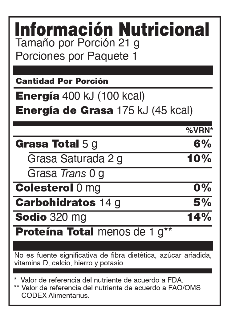 Harina de Papa, Aceite de Palma, Almidón de Maíz, Sal, Sazonador Crema Cebolla (Cebolla en Polvo, Crema en Polvo, Glutamato Monosódico (acentuador del sabor), Sabor Natural y Artificial de Crema, Sabor Natural y Artificial de Cebolla, Ácido Cítrico (regulador de la acidez), Perejil), y TBHQ (antioxidante).