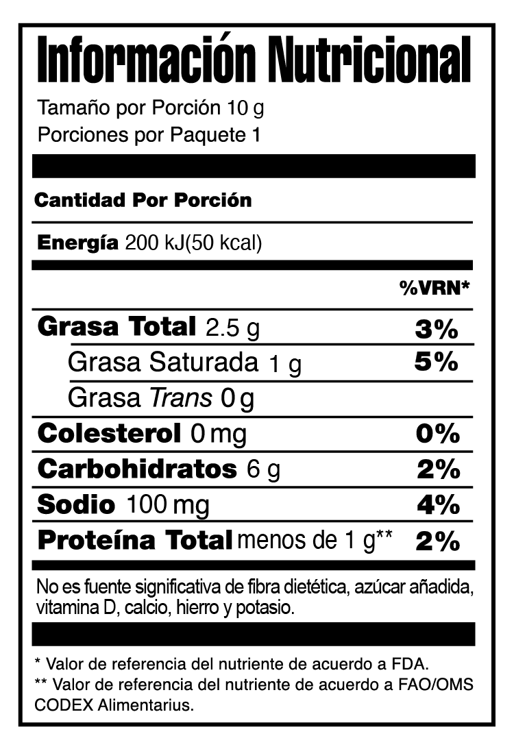 Sémola de Maíz, Aceite de Palma, Sazonador de Queso (Sal, Almidón de Maíz, Suero de Leche en Polvo, Maltodextrina, Sólidos de Jarabe de Maíz, Harina de Maíz Nixtamalizado, Saborizantes Naturales y Artificiales, Leche en Polvo, Crema Vegetal en Polvo, Glutamato Monosódico (acentuador del sabor), Especias, Queso (cultivos de queso, sal y enzimas), Proteína Láctea, Laca Tartracina y Laca Amarillo Ocaso FCF (colorantes artificiales), Aceite Vegetal Parcialmente Hidrogenado, Ácido Cítrico (regulador de la acidez), Cebolla en Polvo), y TBHQ (antioxidante).