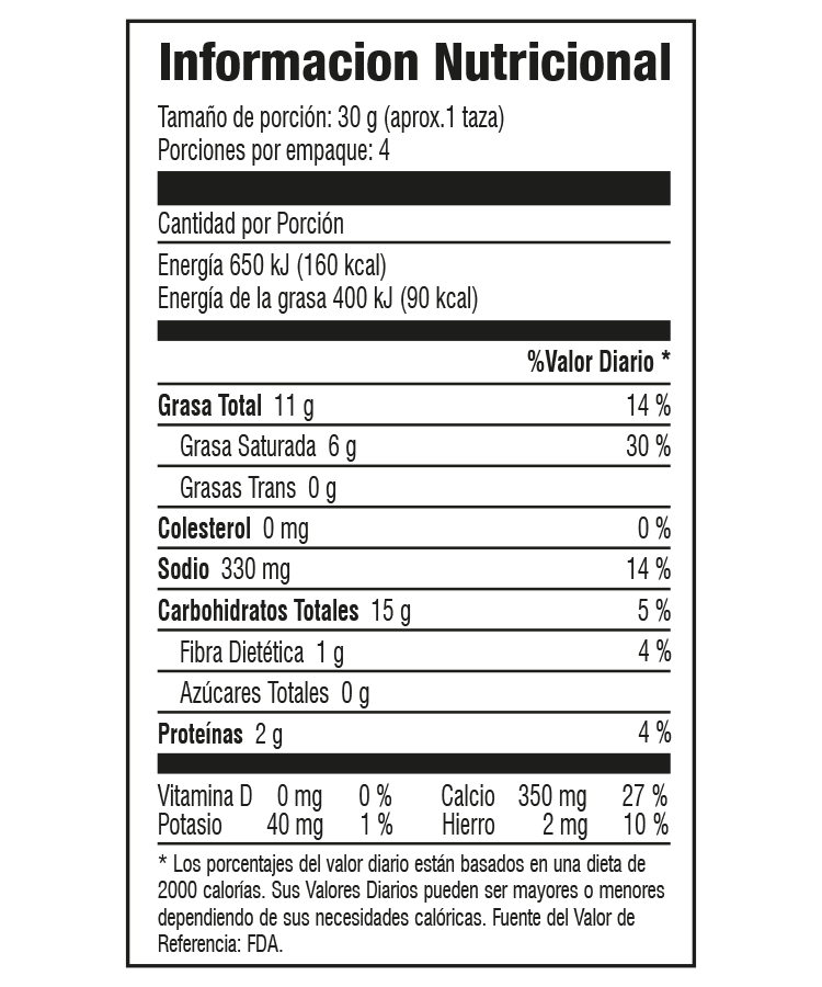 Harina de maíz, aceite vegetal, sal, saborizante a queso, condimentos, colorantes naturales y artificiales. Puede contener trazas de leche, soya y trigo.