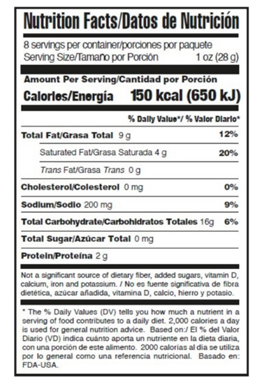 Sémola de Maíz, aceite de palma, sazonador de queso (suero de leche en polvo, almidón de maíz, sal, glutamato monosódico (acentuador del sabor), queso cheddar (leche pasteurizada y cultivada, sal y enzimas), sabores artificiales, leche descremada en polvo, proteína de leche, ácido cítrico y fosfato disódico (reguladores de la acidez), tartracina y amarillo ocaso FCF (colorantes artificiales)), carbonato cálcico (estabilizador), mono y diglicéridos (emulsificante) y TBHQ (antioxidante).